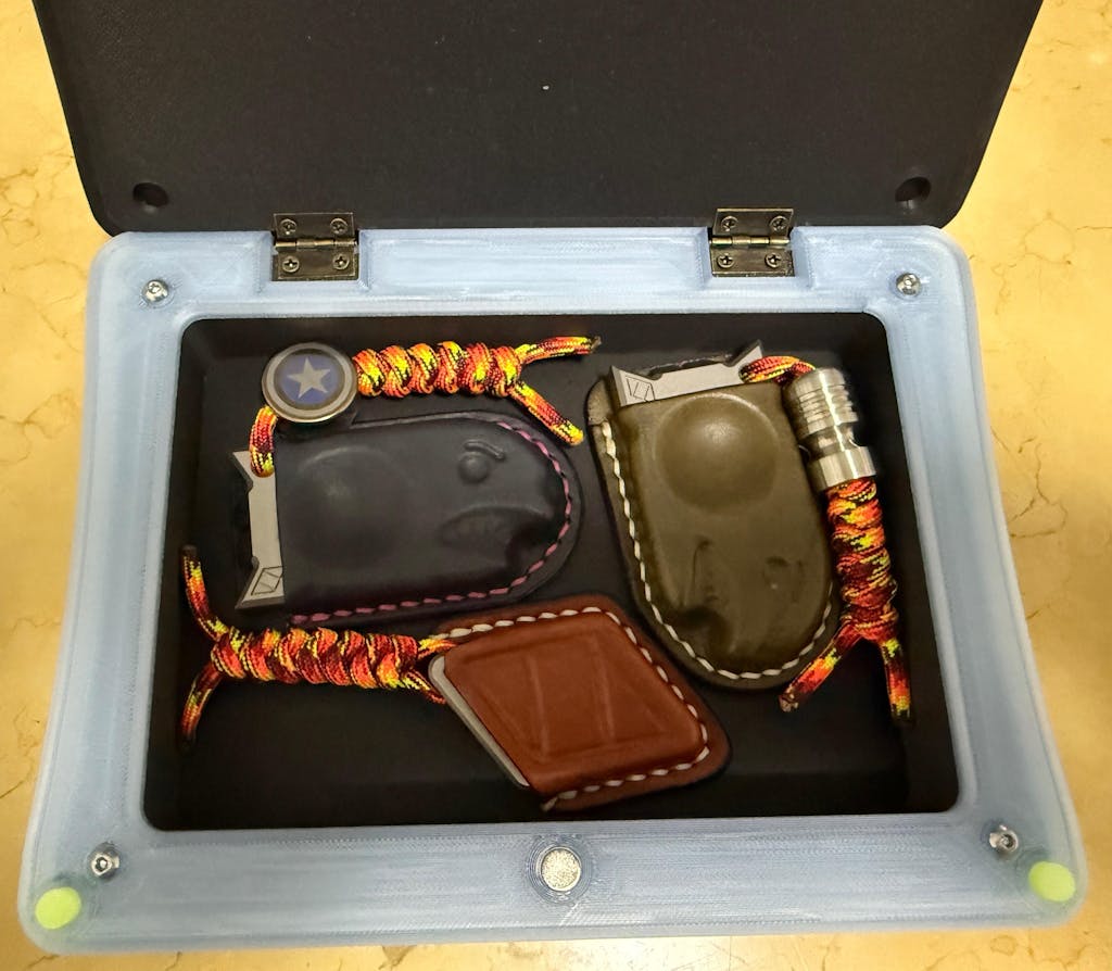 Constructed from precision laser-cut matte black acrylic and enhanced with a series of custom 3D-printed panels in both solid and translucent finishes, the Halo stands apart with its unmistakable presence. Each element is thoughtfully designed to create visual depth and tactile interest, resulting in a truly one-of-a-kind enclosure. To elevate both form and function, we’ve embedded our proprietary Embrite™ glow pellets in the front corners - offering a subtle, ambient glow that guides you to your valuables even in low light.